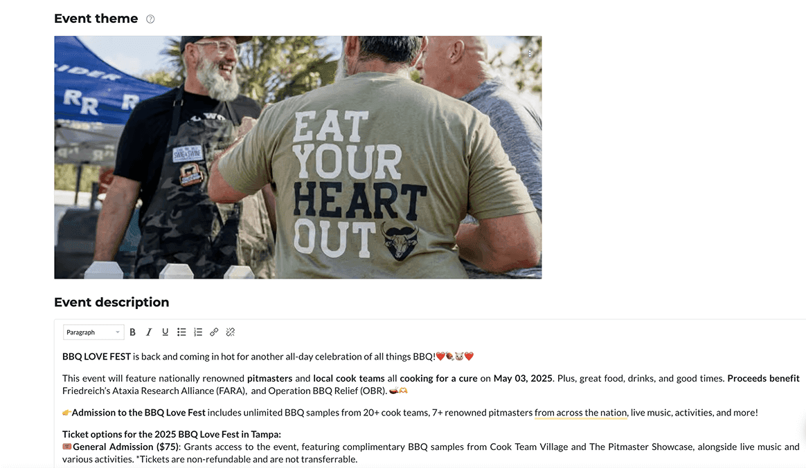 The description is the place to capture potential attendees attention. Throw in the emojis, the bold text, and brag away. What is your event going to feature that's going to make people want to purchase tickets? This is your chance to brag about how great it's going to be. We suggest making it detailed. Do not just make it a quick short sentence.