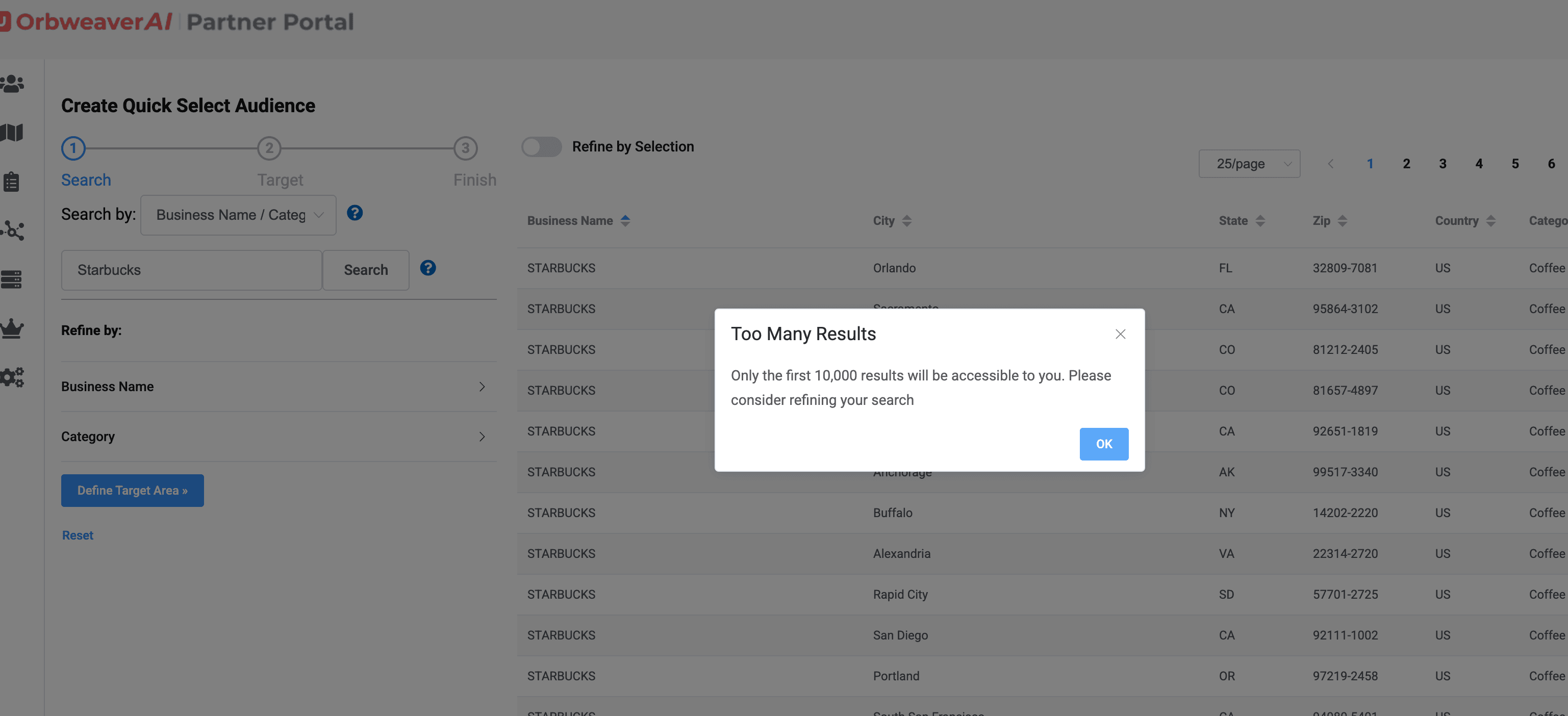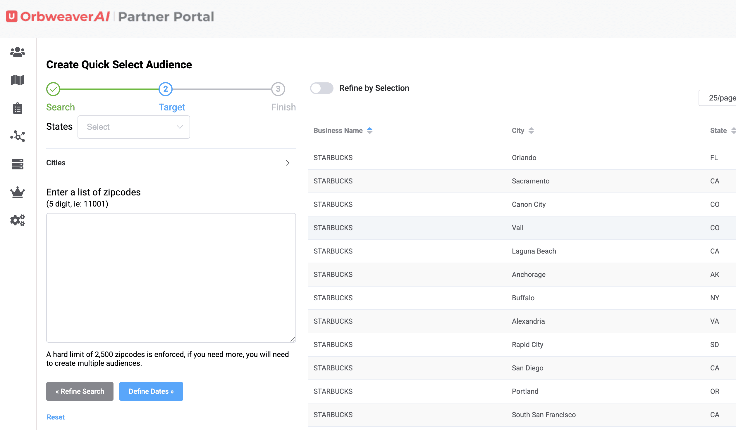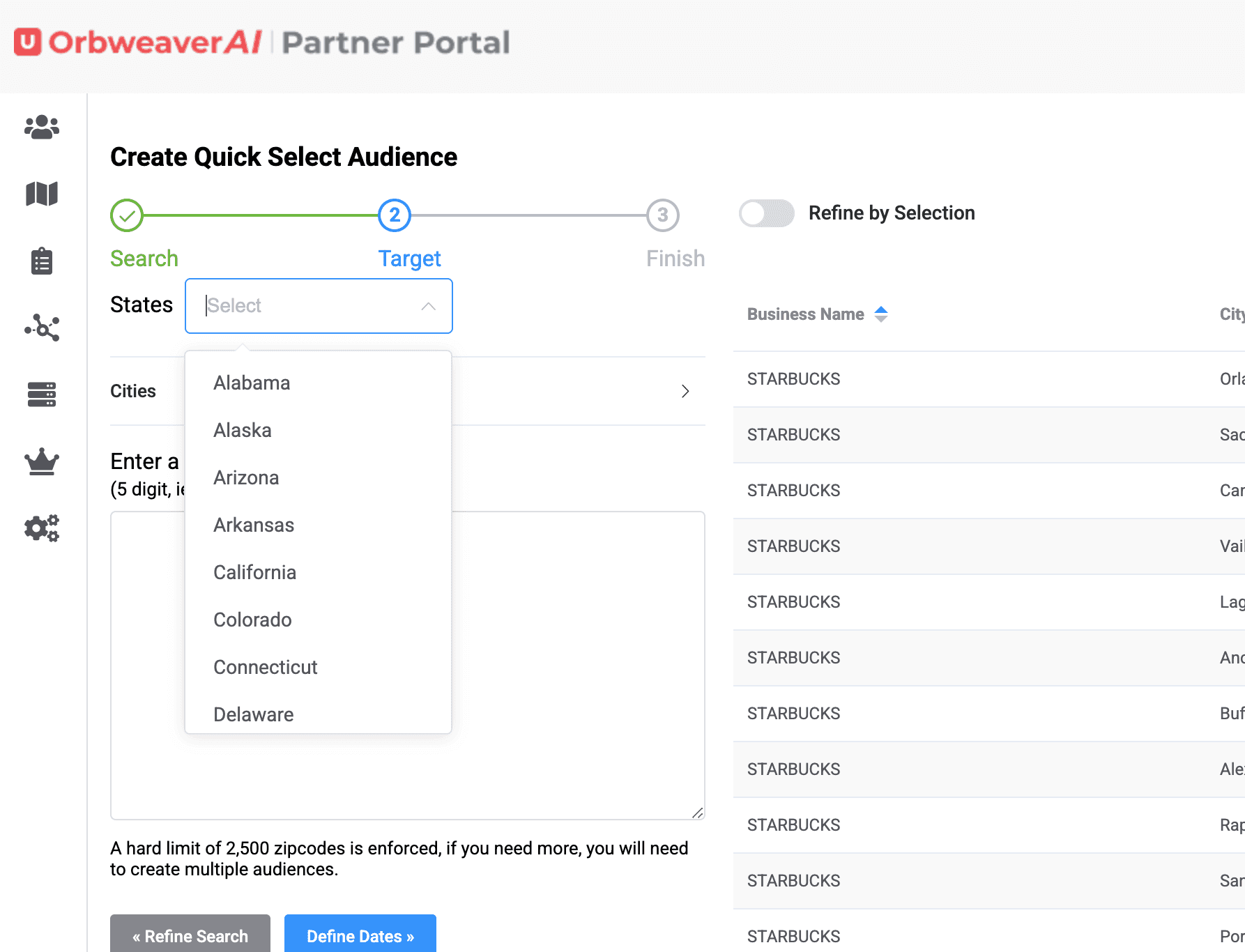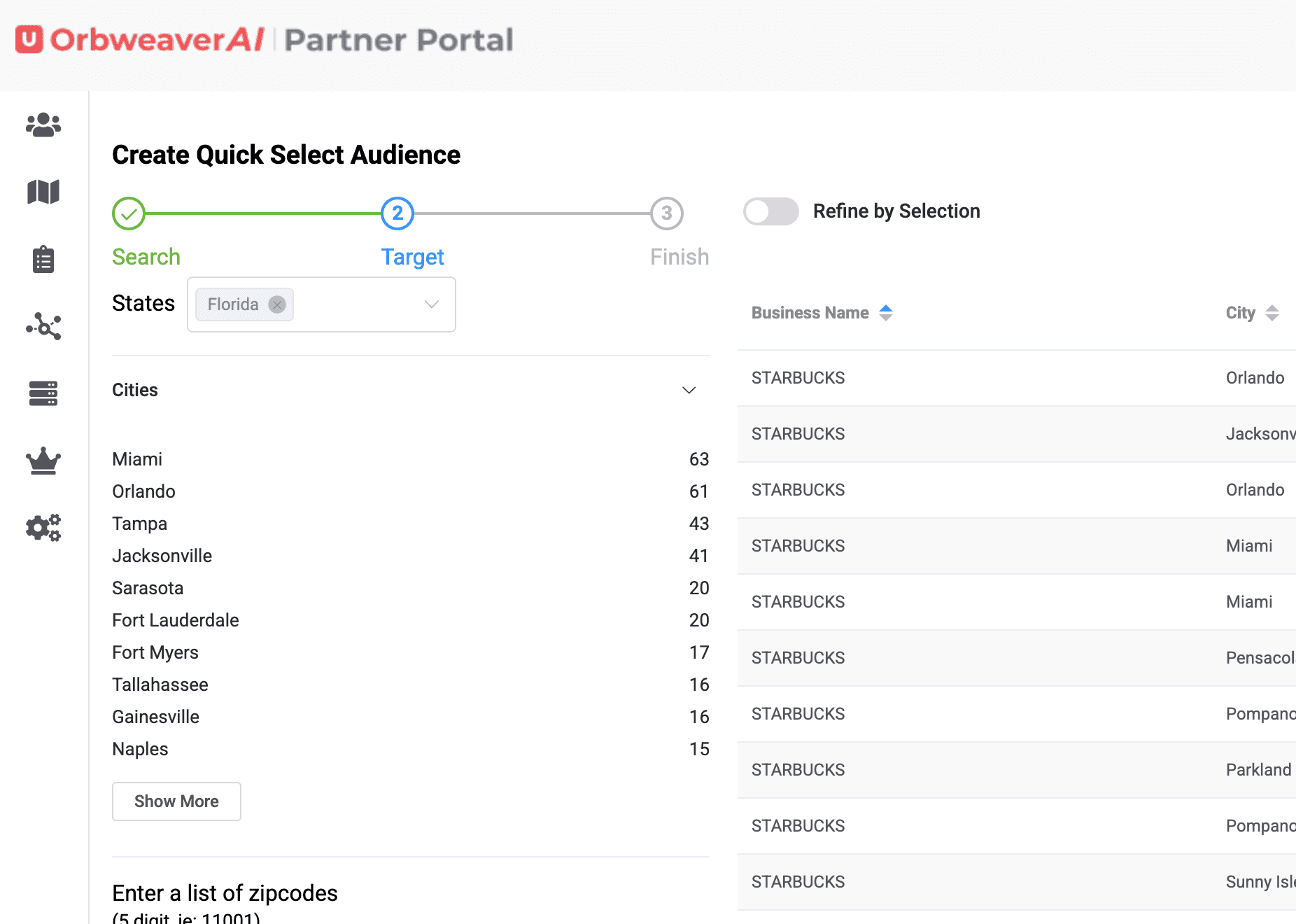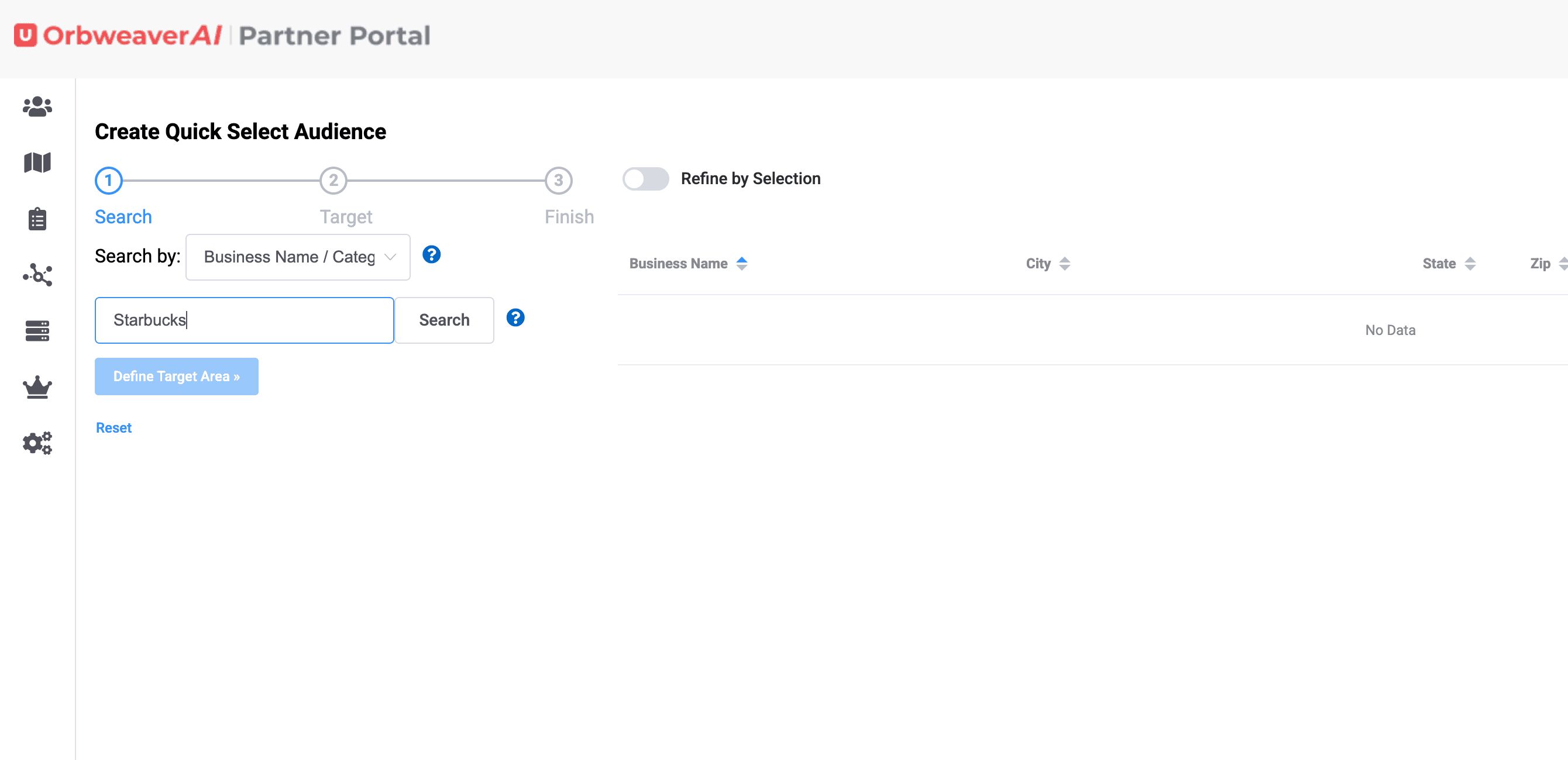 The Quick Select audience feature on OrbweaverAI is meant to save you time. We have thousands of businesses saved in the database to make it easy for you to build complex audiences in seconds. First step is to choose the Quick Select Audience feature on the Left Hand Menu.