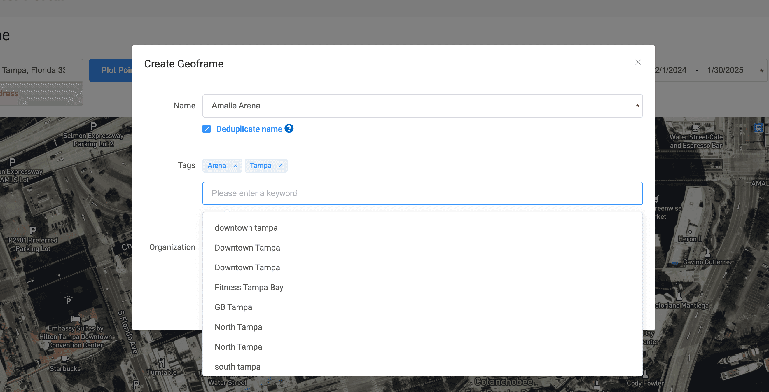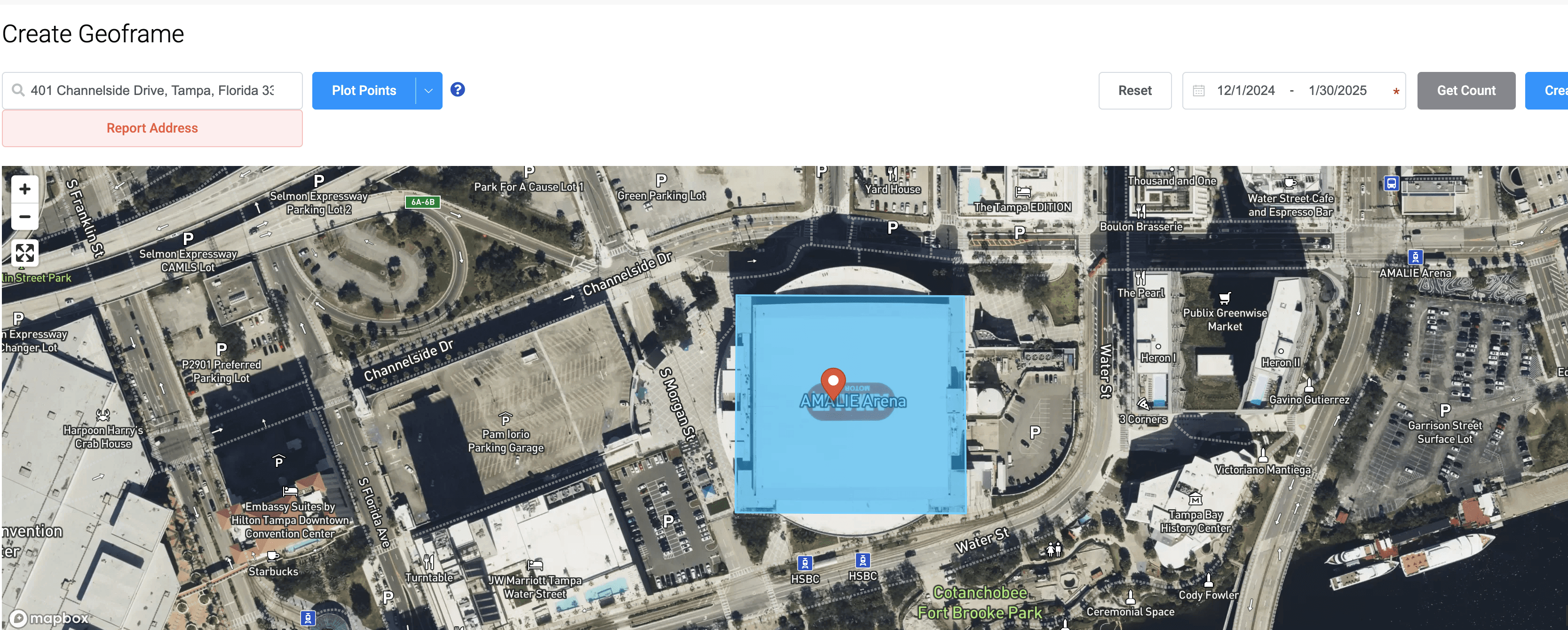 From there, once you see the location that you would like to draw a Geoframe around, you do it with a series of mouse clicks. First, find the one corner and click your mouse once. Second without letting go of mouse, move to the second corner and click your mouse once. Third, again without letting go of mouse, move to the third corner and click your mouse once. Lastly, move your mouse to final corner without letting go of mouse and Double Tap. Once you double tap you will see the location Geoframe turn blue, at that point you have created your Geoframe. On the top right of screen, above the map, you will see options to select data range as well as name your Geoframe.