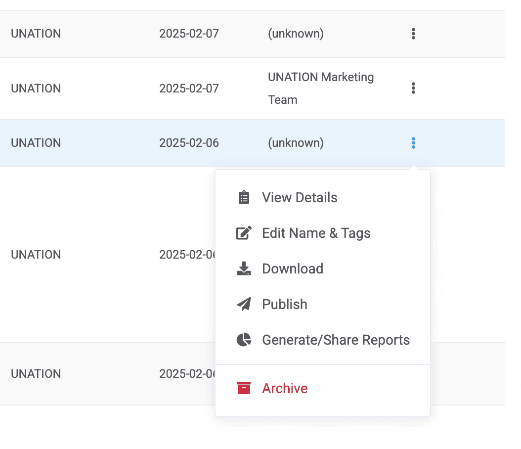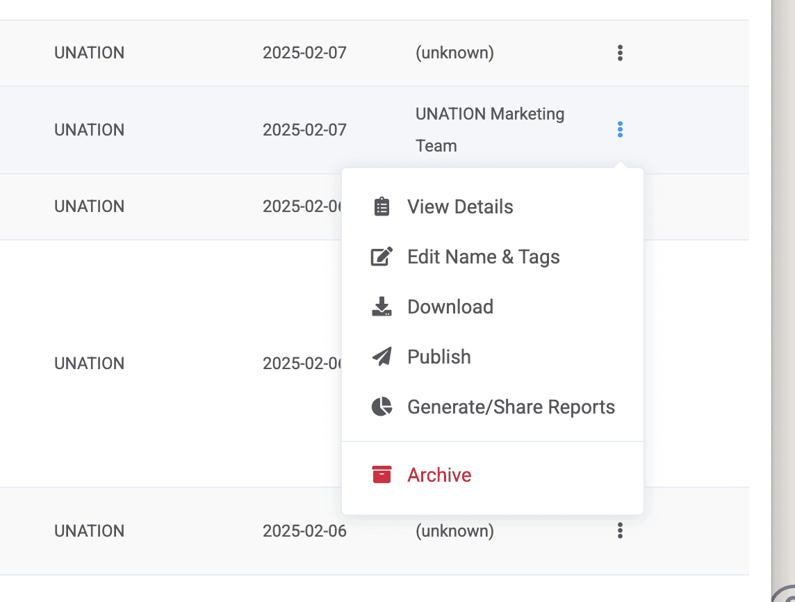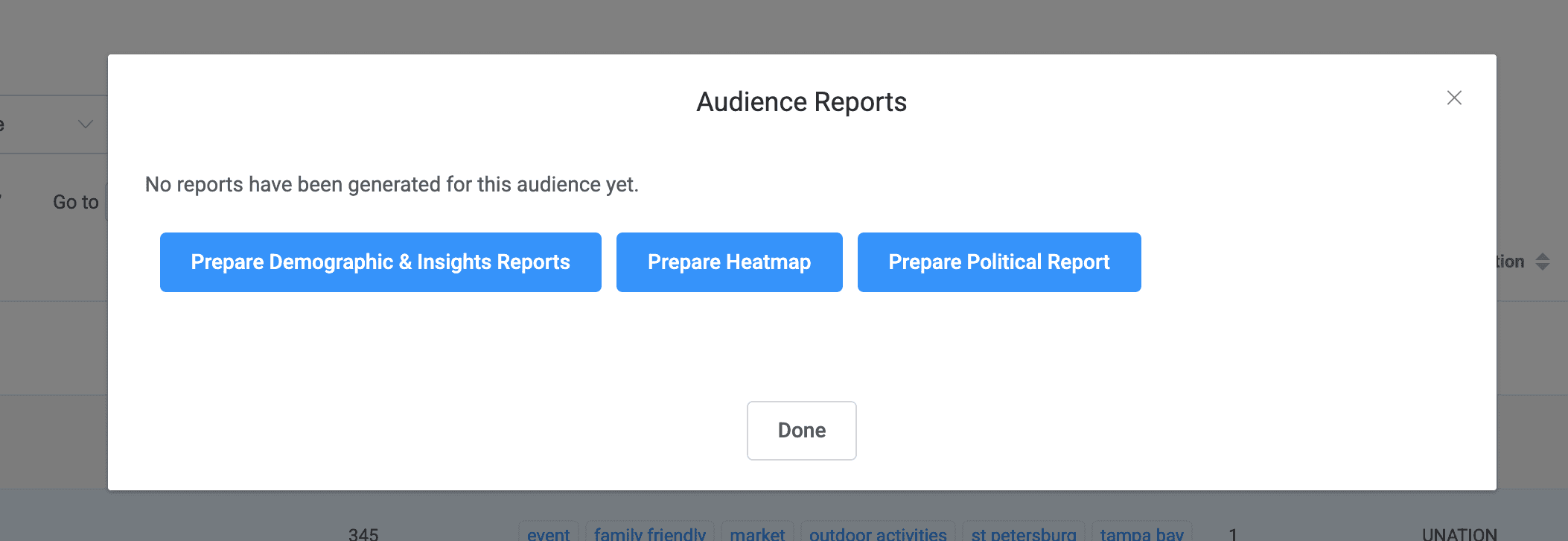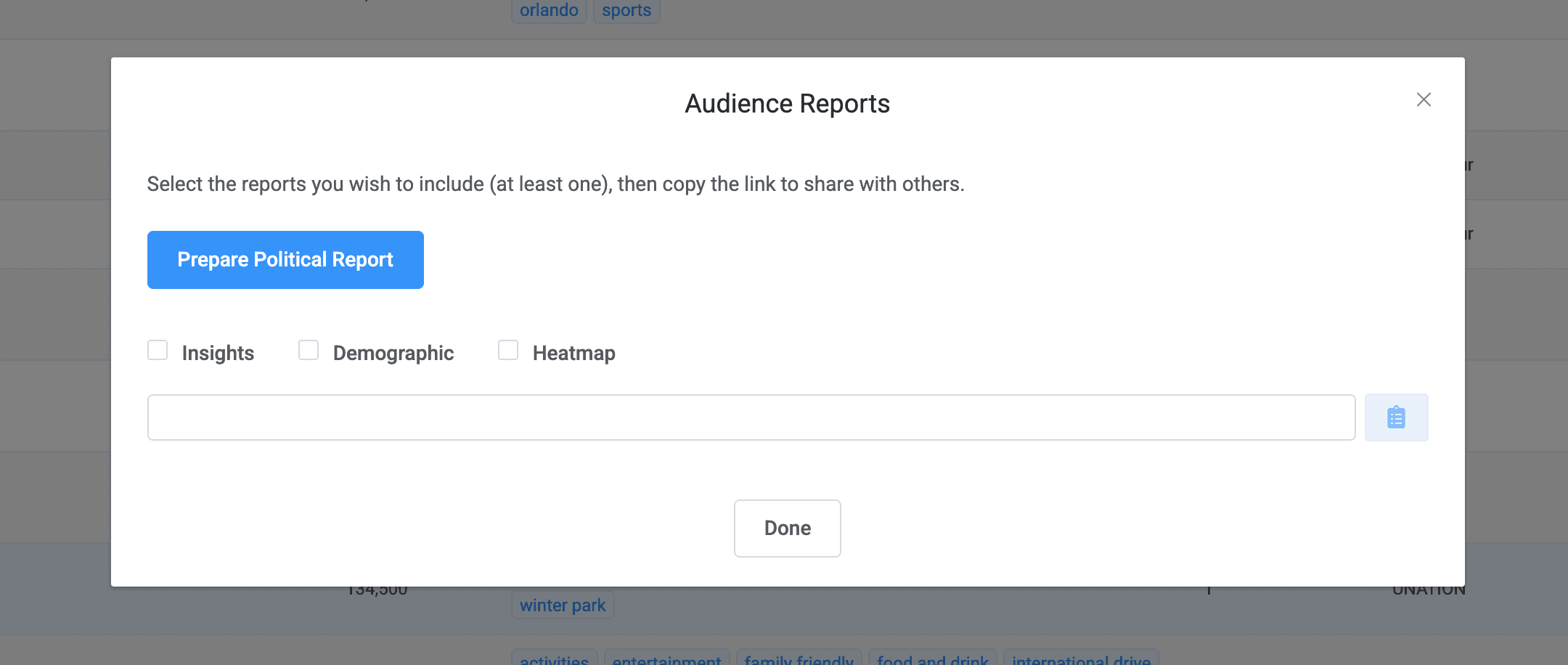 To generate and share reports for your clients, or for specific insights, tap into the snowman menu and select "generate/share reports." A pop up will appear and you can select the type of report you are interested. You can select multiple options. Once selected, your reports will run in the background and may take up to 5-20 minutes. Once complete, you can tap on the snowman menu again and select "generate/share reports" again and your pop up will now show selection boxes. Check the ones you are interested in (can choose multiple) and select "done." Your reports will open in another tab with a unique URL that you can share with your team or client