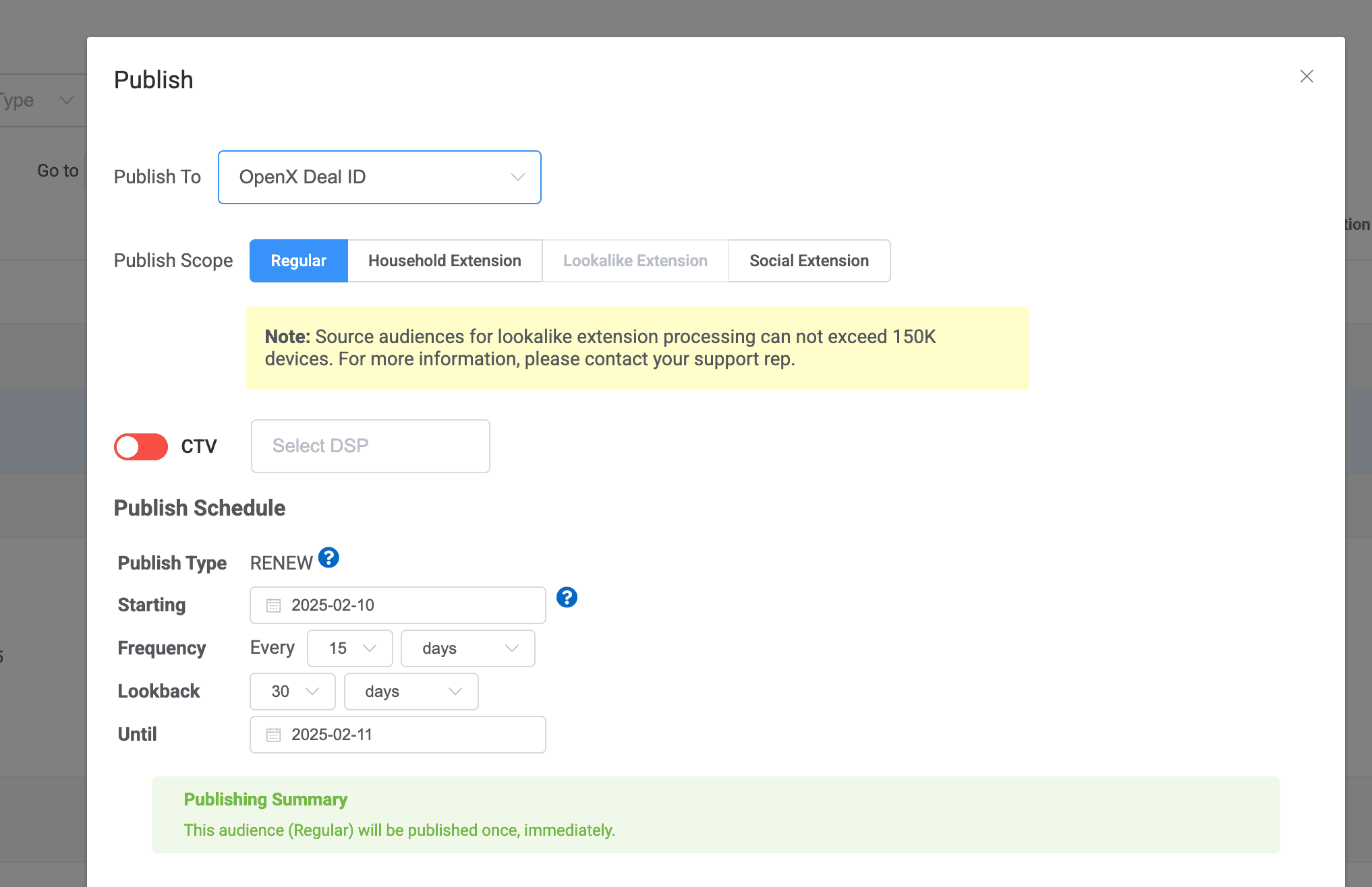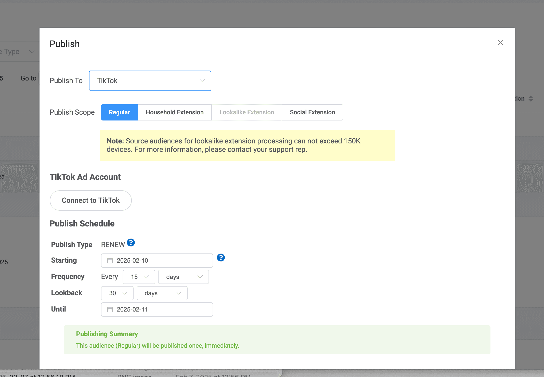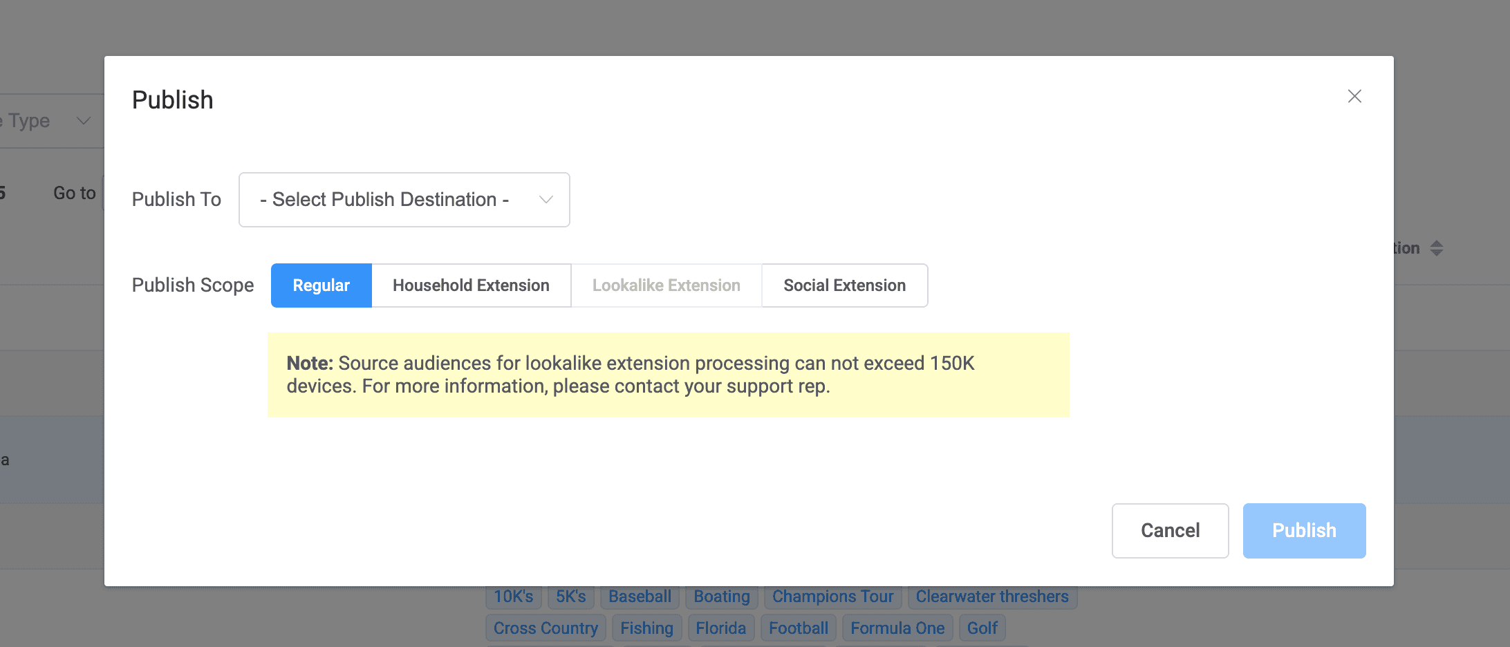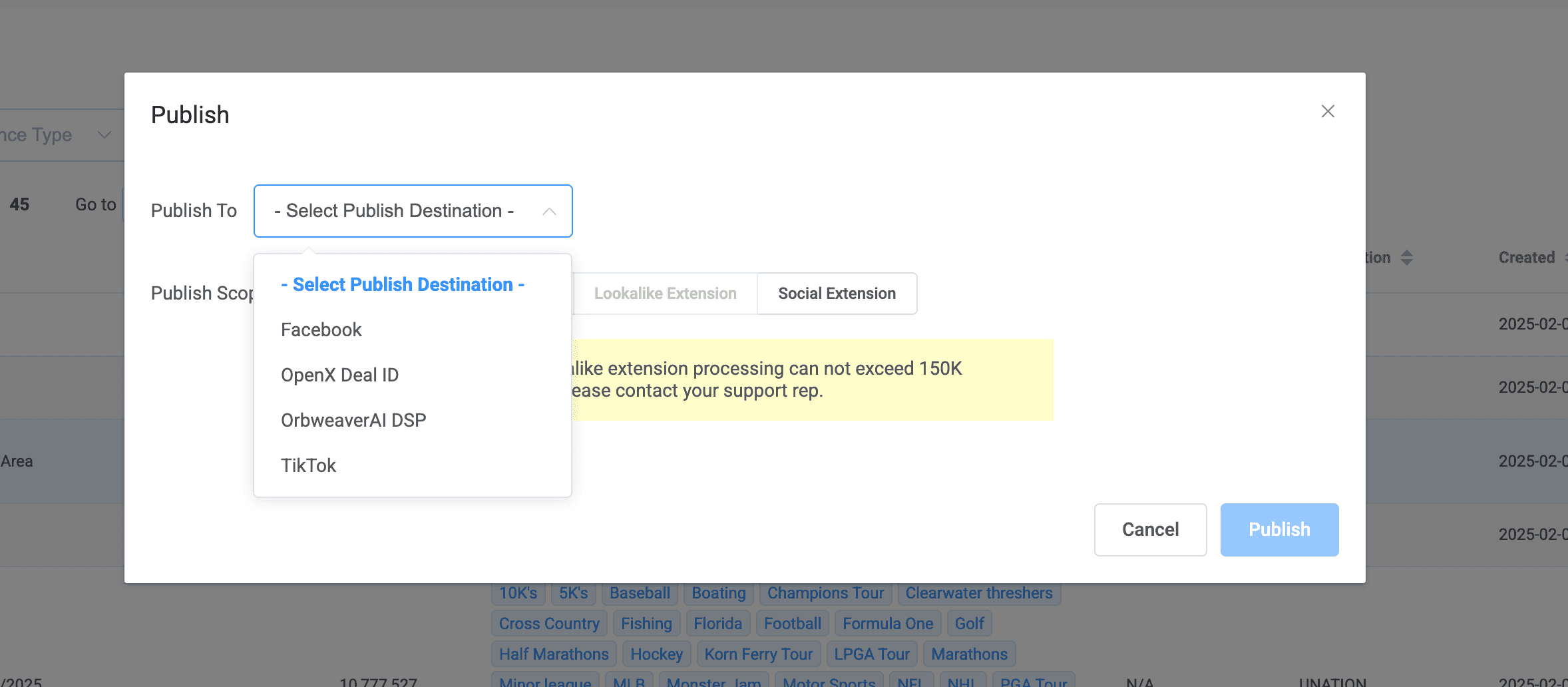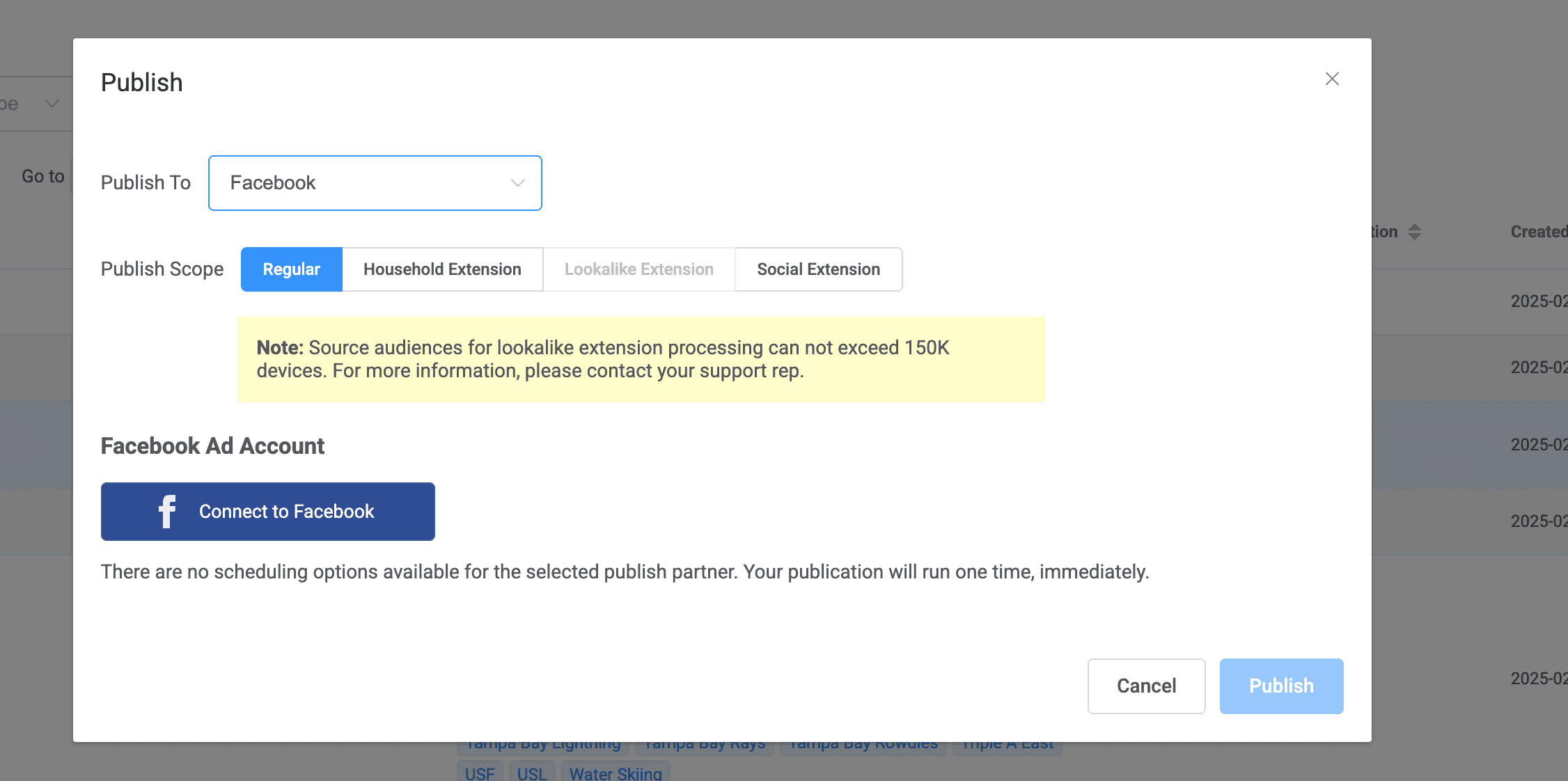 To publish your audience to a desired ad network, simply tap into the snowman menu on the far right of your selection and choose publish.