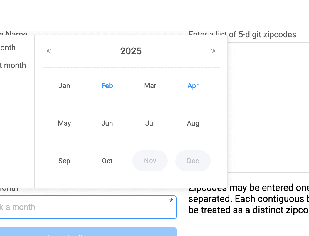 Create an audience based on historical behavior patterns to identify MAIDs that are likely to move to a new home address. Choose the "Predicted Mover" option in Left Hand Menu. From there, you can choose as many zip codes as desired, name your audience and select the months that those unique MAIDs are expected to move.