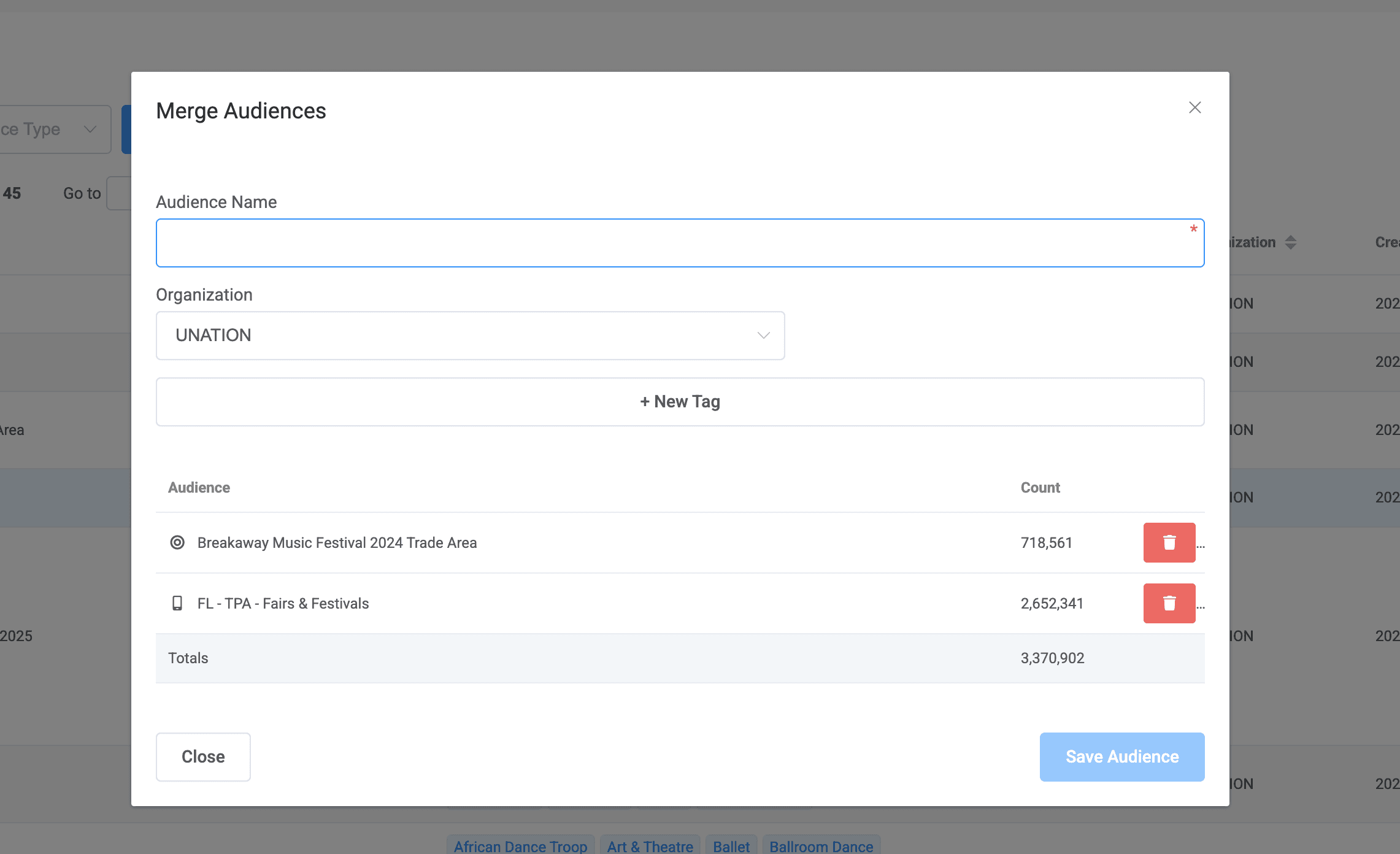 In your Audience Library there are a number of ways to search, filter and merge content. To search, you can type an audience title or keyword into the search bar. To filter to your type of download, you can tap into the dropdown of "Audience Type." And if interested in merging content, you can select up to five separate audiences by checking the select box, at which point you can merge multiple audiences into one new audience