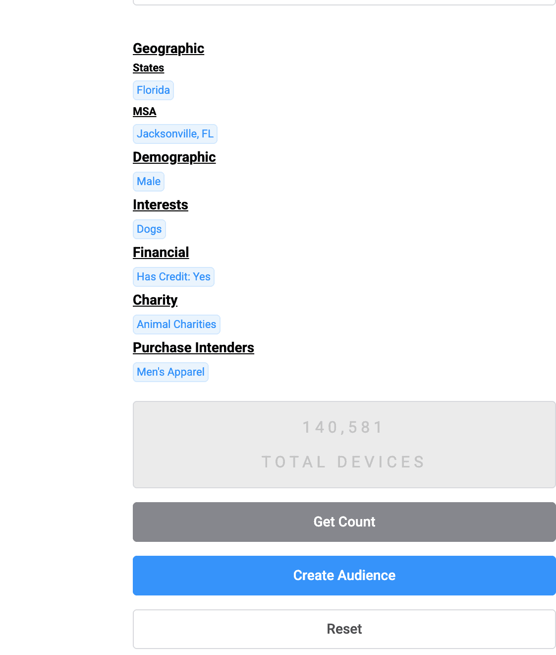 Next, you can select as many options as you like from location, interests, purchase propensity, demographics, income level, credit score, etc.